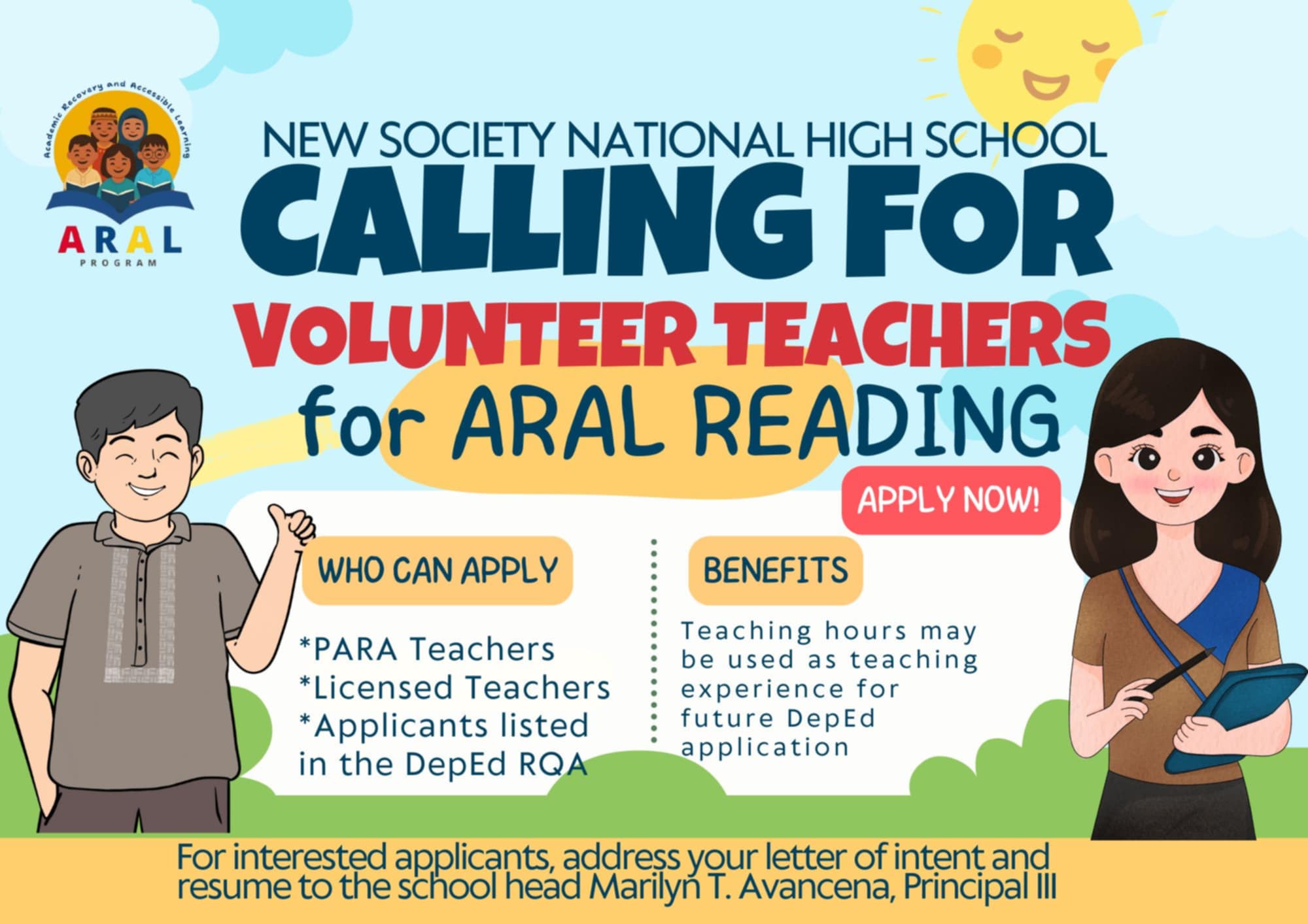 New Society National High School is now looking for Volunteer Teachers who are willing to share their time, skills, and passion for teaching to help our junior high school learners succeed.
