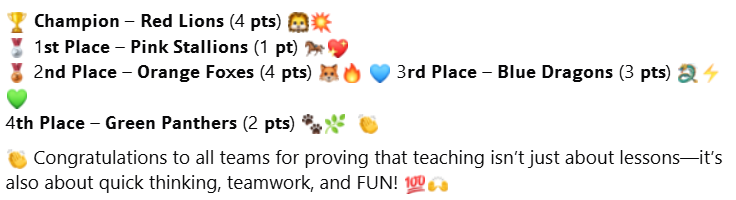 The stage was on fire as our brilliant teachers clashed in a battle of wit, speed, and teamwork at Teacherlympics 2025! Each round kept everyone on edge, but only one team rose to the very top!