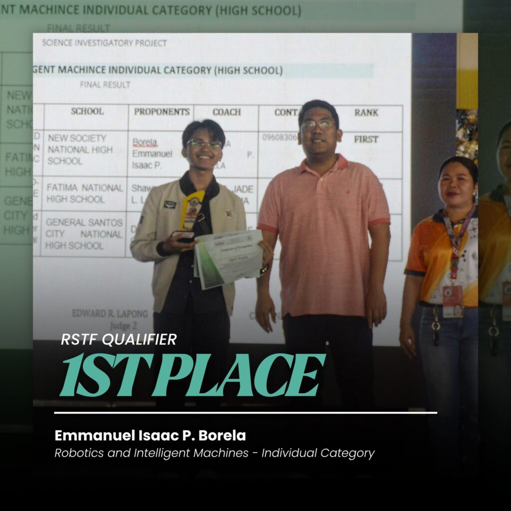1st Place | Robotics and Intelligent Machines – Individual Category | Emmanuel Isaac P. Borela | YES |