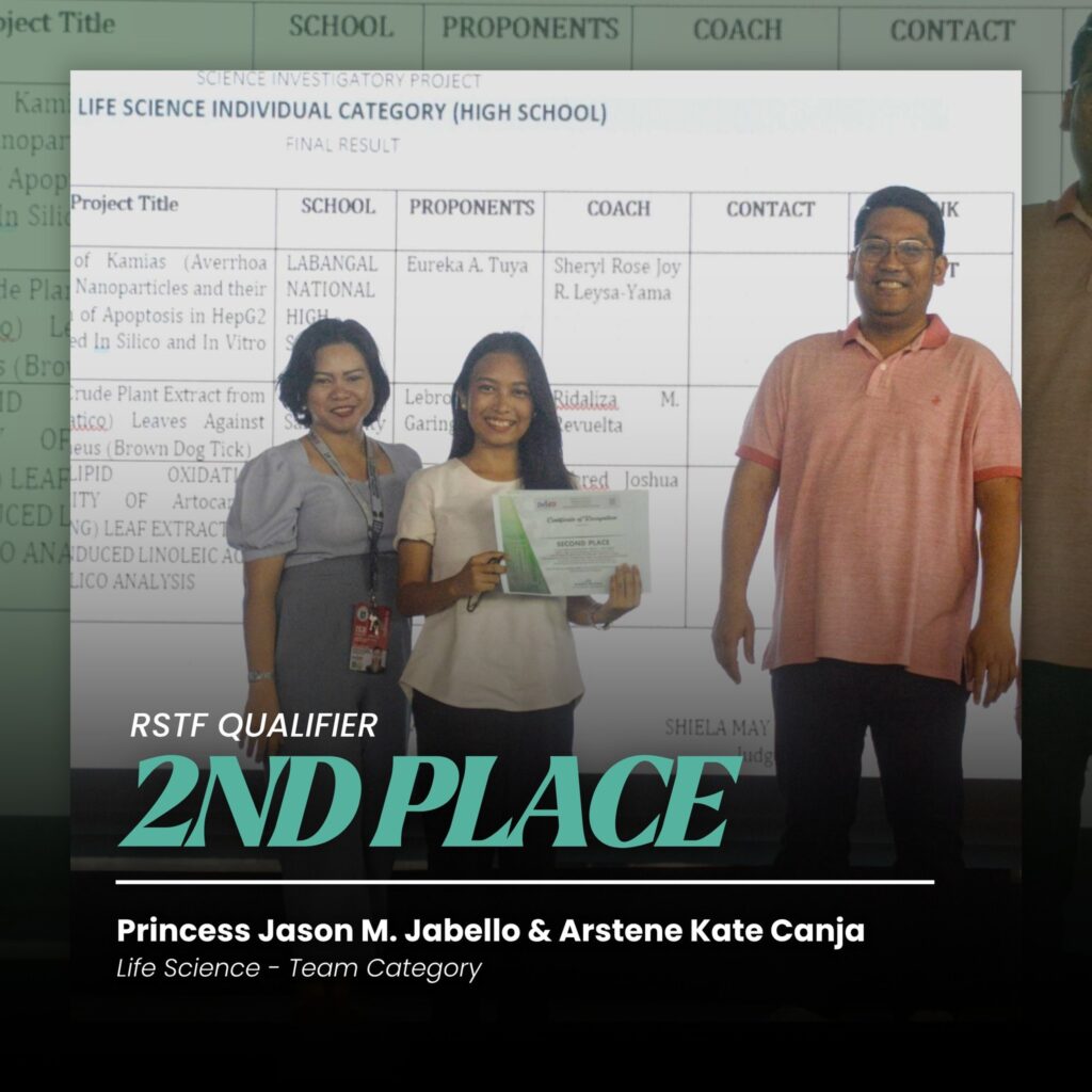 2nd Place | Life Science – Team Category | Princess Jason M. Jabello & Arstene Kate Canja | YES |