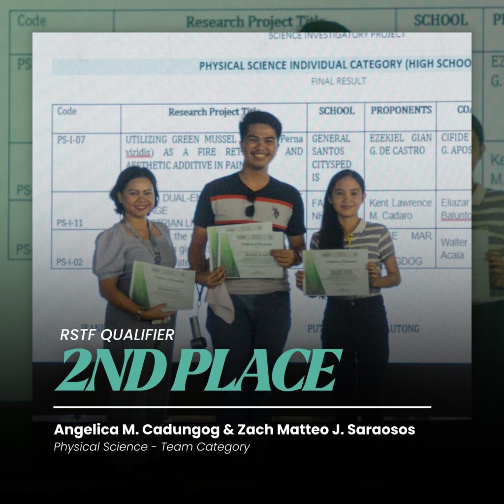 2nd Place | Physical Science – Team Category | Angelica M. Cadungog & Zach Matteo J. Saraosos | YES |