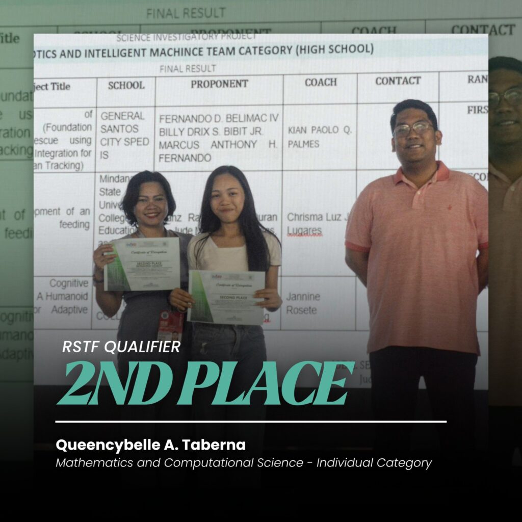 2nd Place | Mathematics and Computational Science – Individual Category | Queencybelle A. Taberna | YES |